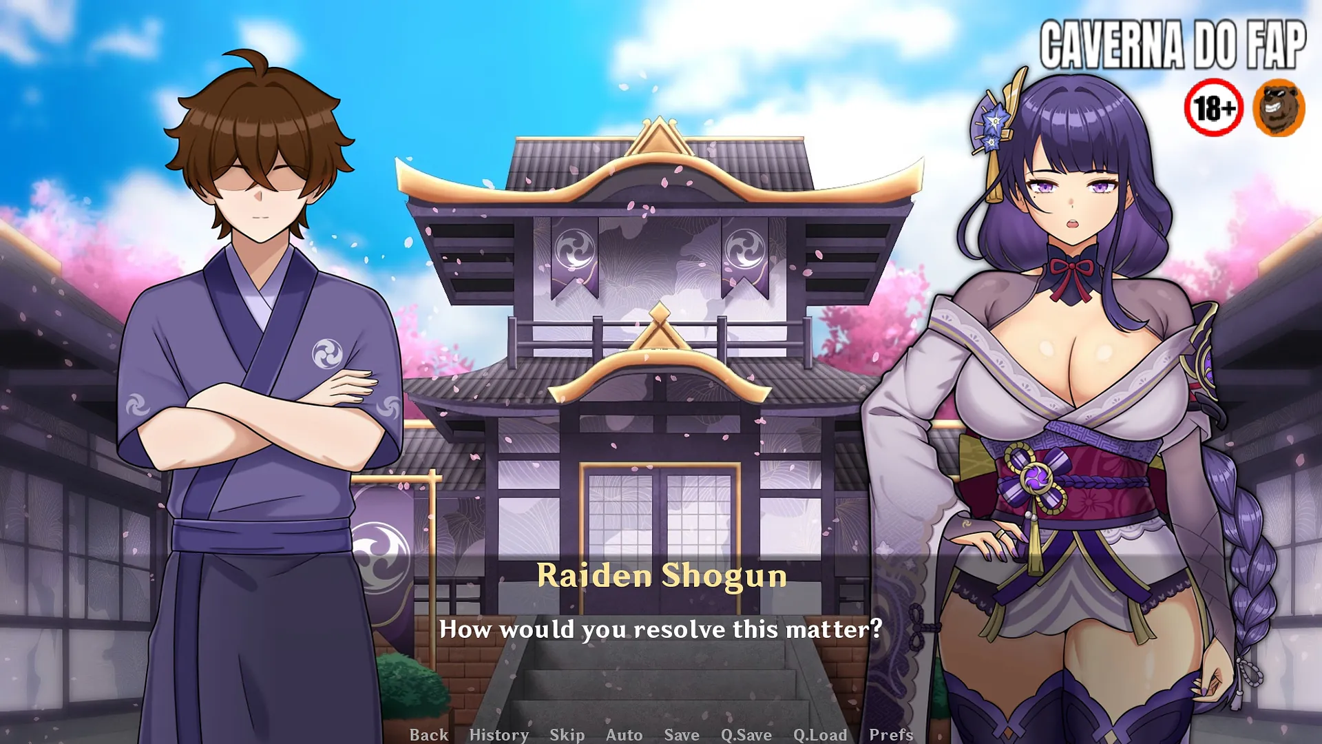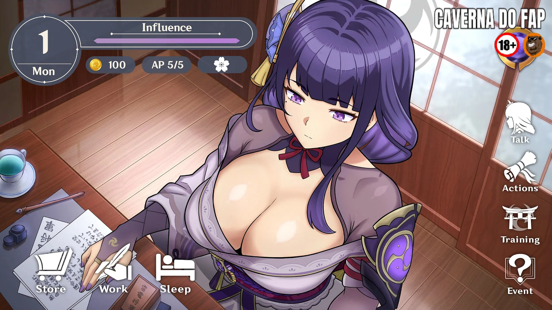 Bem-vindo a Shogun Trainer, um fangame baseado no universo Genshin e com Raiden Shogun como protagonista. Neste jogo, você assumirá o papel de Chefe Administrativo do Xogunato, enquanto usa o Talismã da Cortesia Eterna para colocar Raiden sob seu controle. Por meio de atividades diárias, sessões de treinamento e decisões estratégicas, você vai moldar como Raiden responde a você e como o relacionamento evolui.